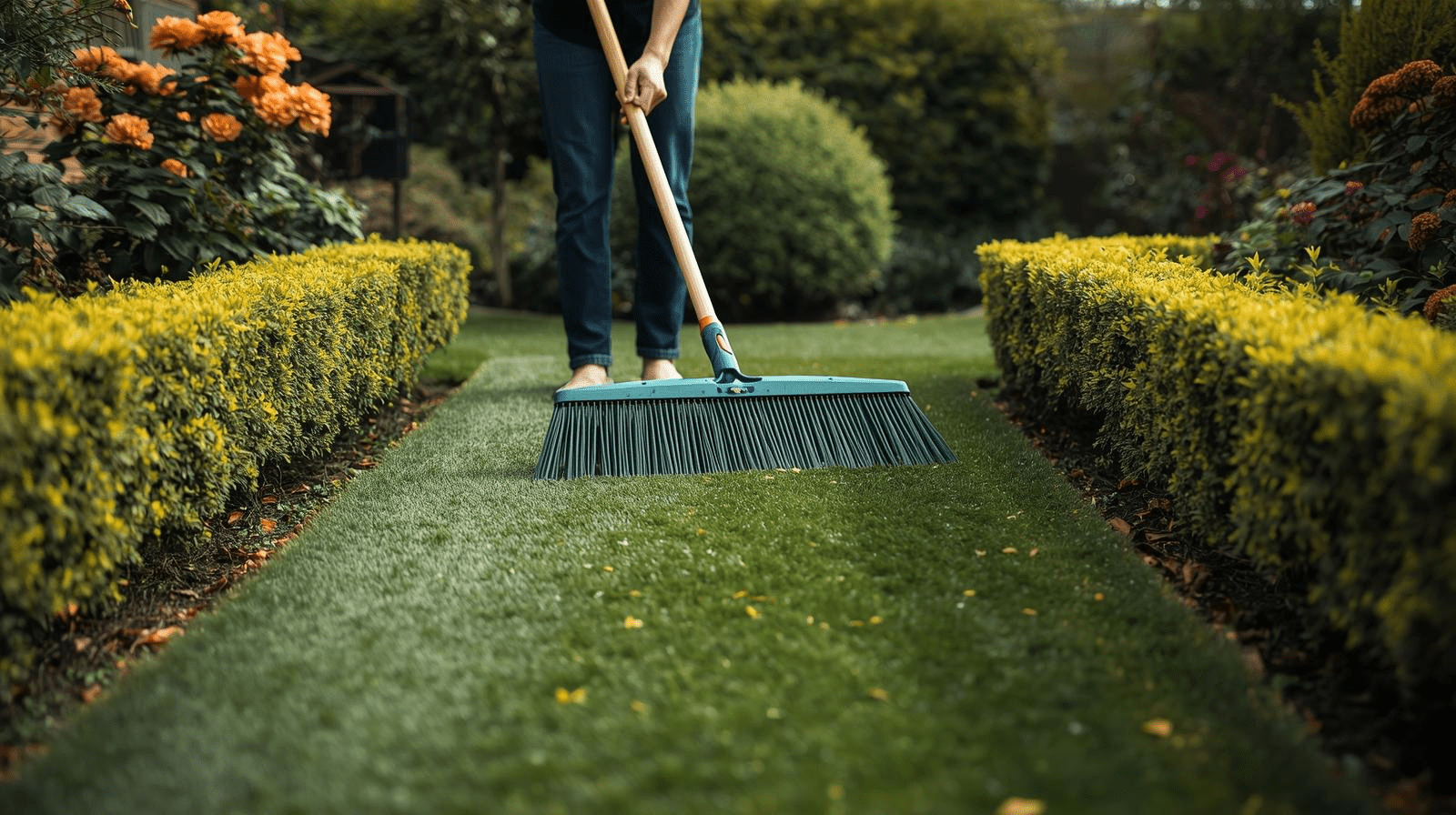 Door het kunstgras stevig te borstelen met een harde bezem (geen staalborstel!), trek je de sprieten weer mooi overeind. Dit zorgt voor een betere ventilatie tussen de vezels, waardoor de mat sneller droogt. Vaak borstel je de eerste loszittende aanslag er zo al vanaf. Zie je daarnaast dat jouw kunstgras platgelopen is? Lees dan snel onze blog over platgelopen kunstgras herstellen.